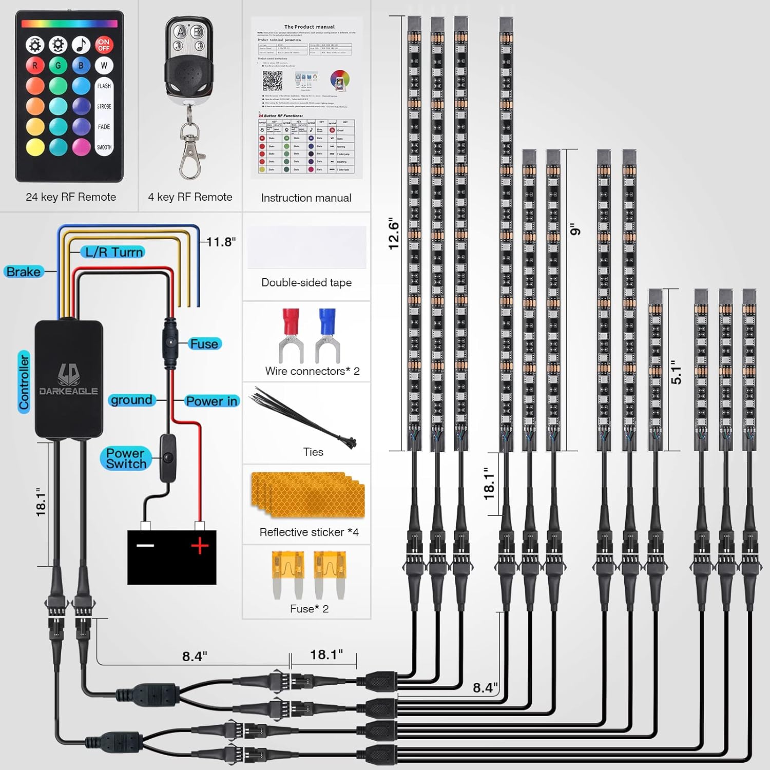 Con 144 LED luminosi, questo kit offre una palette sorprendente di 16 milioni di colori e 29 modalità dinamiche come lampeggiamento, respirazione e salto. Integra anche funzioni di frenata e indicatori di direzione per una sicurezza migliorata e vanta una classificazione impermeabile IP68, garantendo longevità e affidabilità.