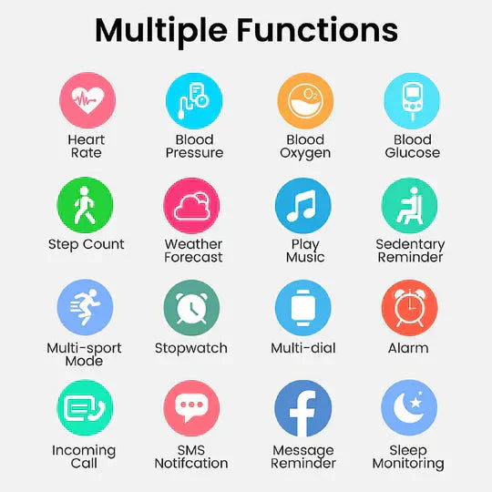 Questo dispositivo straordinario va oltre il semplice monitoraggio della glicemia; include anche il monitoraggio dell'ossigeno nel sangue. Monitorando i tuoi livelli di ossigeno, ottieni informazioni essenziali sulla tua salute respiratoria, assicurando che il tuo corpo riceva l'ossigeno di cui ha bisogno. Con un design elegante e alla moda, questo smartwatch si integra perfettamente nella tua vita quotidiana, combinando sofisticatezza e funzionalità in un unico dispositivo impressionante.