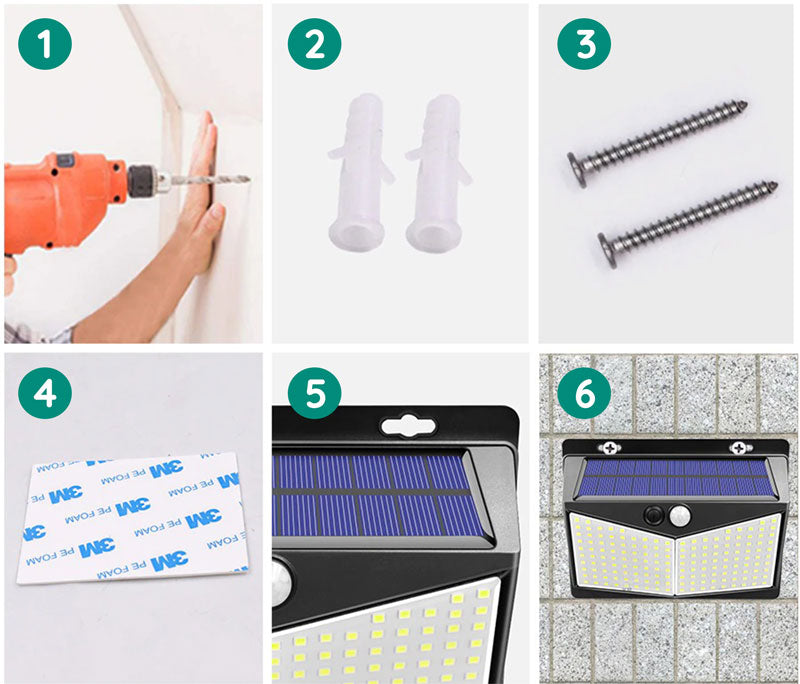 Le nostre luci di sicurezza solari wireless possono essere montate rapidamente usando le viti incluse, i tasselli a espansione, il nastro adesivo per il montaggio, il filo sottile o i tuoi metodi inventivi.