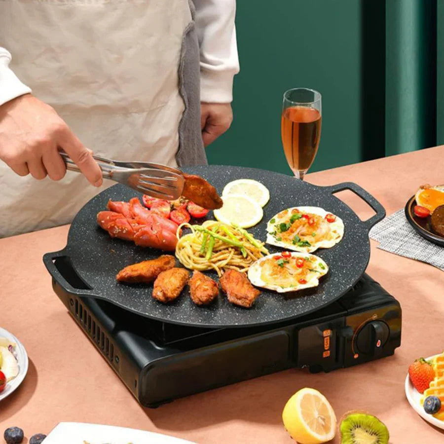 Passa senza problemi dalla cucina interna alla grigliata all'aperto. Questo strumento adattabile è ideale per fornelli a gas, elettrici, fuochi a legna o pietre riscaldate, rendendolo la scelta perfetta per tutte le tue avventure culinarie. Il suo design senza fumo supporta una grigliata salutare, anche in spazi ristretti, mentre i manici ergonomici offrono comfort durante il trasporto e facilità d'uso.