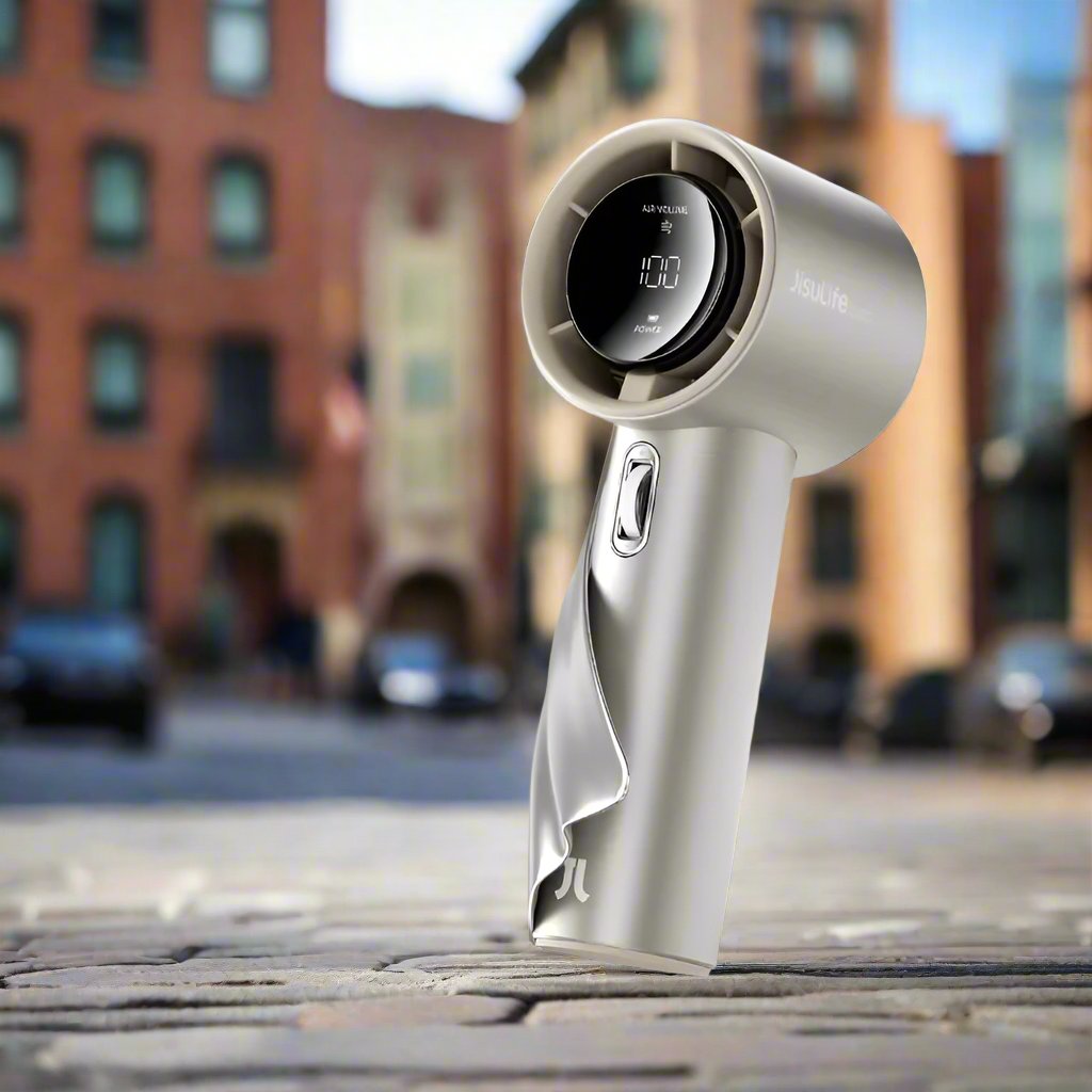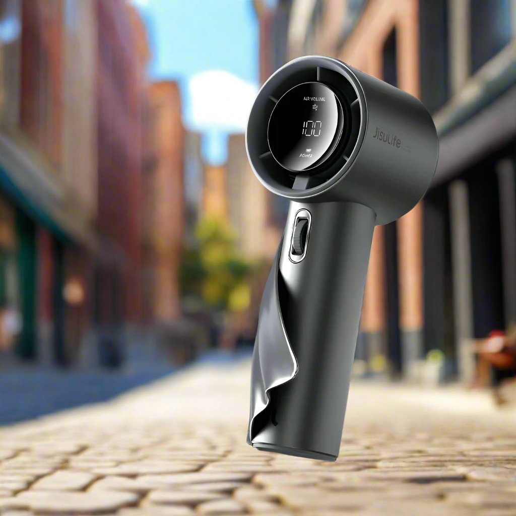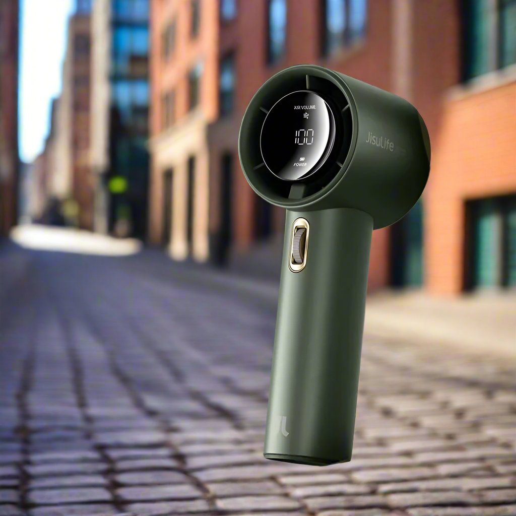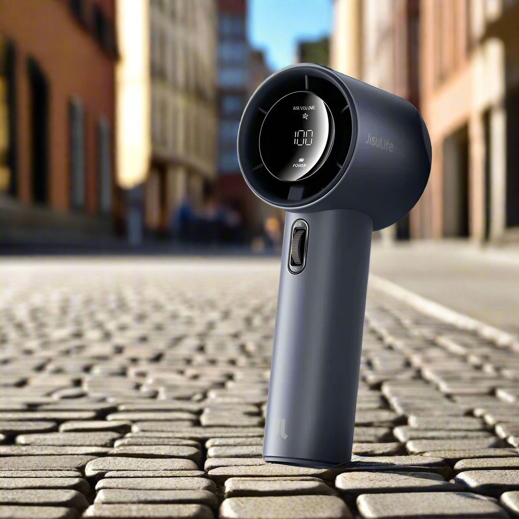 L'intuitivo interruttore a rotella ti permette di controllare il flusso d'aria secondo le tue preferenze, mentre il display digitale ti aggiorna sulla velocità attuale e sulla durata della batteria. Niente più dubbi su quando ricaricare—questo ventilatore è progettato per offrire fino a 15 ore di aria fresca con solo una breve ricarica di 1,5 ore.